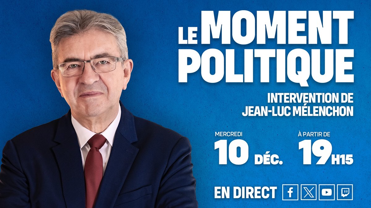 🔴 Ce mercredi 10 décembre, rendez-vous à 19h15 pour suivre en direct une conférence de Jean-Luc Mélenchon sur le moment politique.