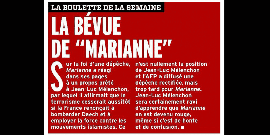 La semaine dernière, Marianne publiait de faux propos de Jean-Luc Mélenchon sur le terrorisme et la guerre en Syrie. Voici ce qui était publié :