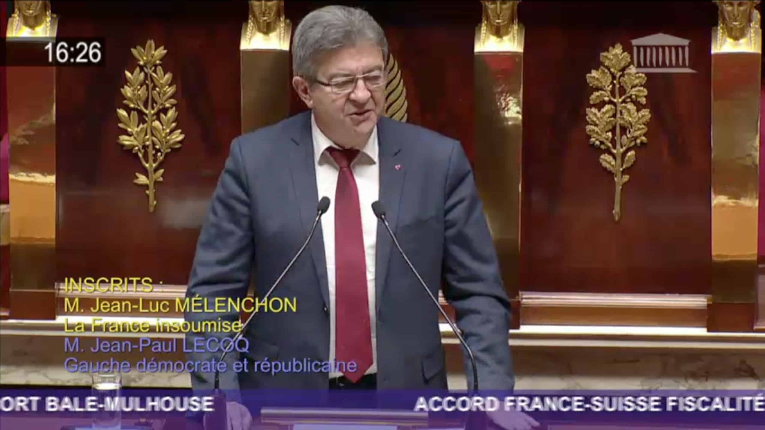 Intervention de Jean-Luc Mélenchon à l’Assemblée nationale le 18 décembre 2017 dans le cadre du débat sur l’Accord France-Suisse relatif à la fiscalité de l’aéroport Bâle-Mulhouse. Il a dénoncé le déséquilibre de cet accord et a appelé à revoir de fond en comble notre relation fiscale avec la Suisse alors que ce pays, qui est un paradis fiscal, apparaît comme l’un des centres internationaux du blanchiment.