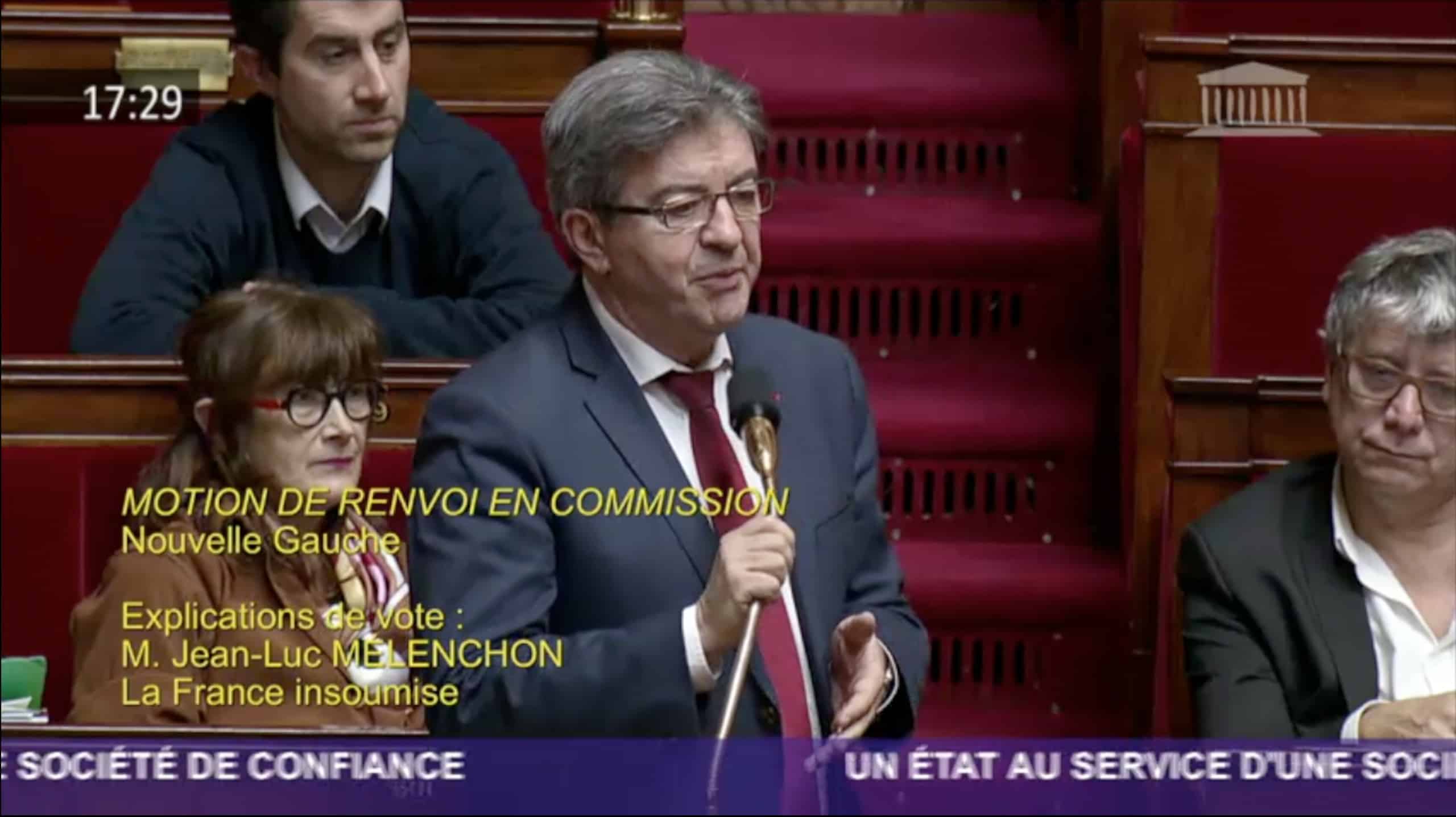 Intervention de Jean-Luc Mélenchon à l’Assemblée nationale le 23 janvier 2018 pour demander le renvoi en commission du « projet de loi pour un État au service d’une société de confiance » (sic). Le président du groupe « La France insoumise » a dénoncé la défiance envers l’État et les fonctionnaire que portait ce projet de loi et a appelé à cesser de « désarmer l’État ».