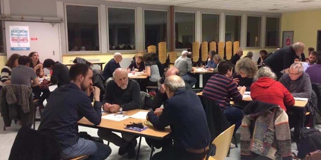 De toute évidence, les insoumis n’ont pas organisé ce soir-là une conférence d’experts sur la sortie du nucléaire. Pas de tribune, pas de chaises en rangs d’oignons, pas d’exposé magistral, alors même qu’un invité de marque était annoncé à l’affiche : Jean-Marie Brom, physicien au CNRS, que Gabriel Amard présente à l’assistance : « Jean-Marie sera notre fiche vivante. Durant toute la soirée vous pouvez le solliciter, lui demander de lever des doutes ou d’apporter des précisions à vos réflexions. » Même sort réservé à la triplette de juristes, installés à une table dans un coin de la salle : « Ils sont là pour nous assurer au fil de l’écriture, que ce que nous produisons est opérationnel en termes juridiques. »