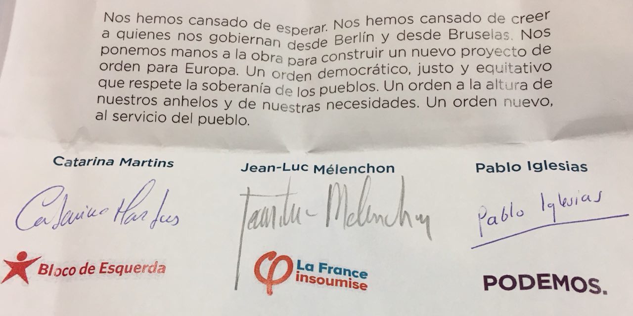 Voici à présent le texte intégral signé à Lisbonne par Caterina Martins pour le Bloco, Pablo Iglesias pour Podemos et moi pour la France Insoumise.