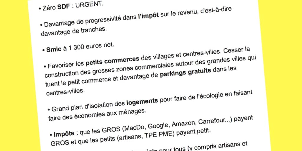 Ce fut notre constat mercredi soir quand nous avons reçu un courrier bien spécial à l’Assemblée nationale. C’était le document listant les revendications émanant de citoyens ayant part au mouvement des gilets jaunes. Sa lecture montre à quel point les demandes populaires exprimées dans le mouvement dépassent maintenant la baisse des taxes sur les carburants. Au fond, celle-ci a fonctionné comme un déclencheur d’aspirations bien plus larges. Deuxième constat troublant pour nous : la quasi-totalité des revendications listées recoupent les propositions du programme de la France insoumise, L’Avenir en commun.