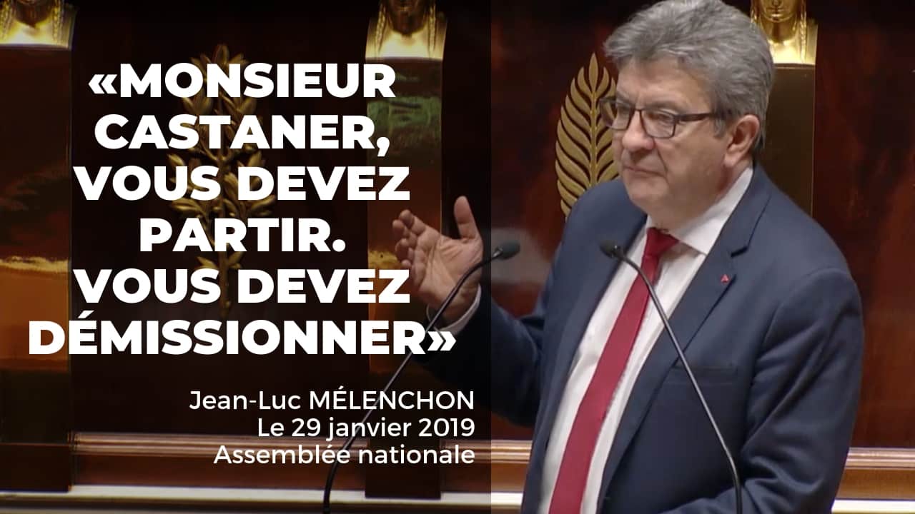 Intervention de Jean-Luc Mélenchon à l’Assemblée nationale le 29 janvier 2019. Le président du groupe « La France insoumise » a rappelé le nombre des policiers blessés et le nombre de gilets jaunes blessés, mutilés ou décédés depuis le début de la mobilisation. Il a décrit une situation sans précédent, même en 1968. Il a donc mis le ministre de l’Intérieur Christophe Castaner face à ses responsabilités et l’a appelé à démissionner. Jean-Luc Mélenchon a également expliqué pourquoi il demandait l’interdiction des flash-ball et des grenades GLI-F4, responsable de nombreuses mutilations.