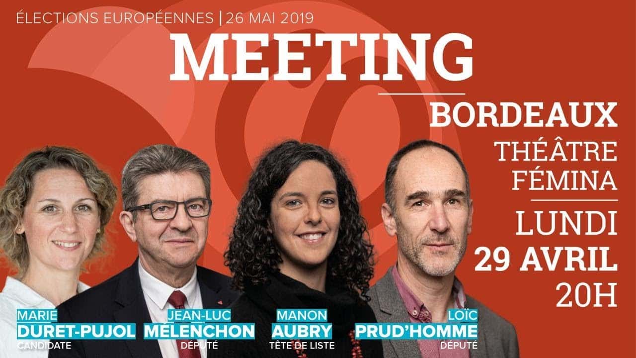 Rendez-vous au meeting de Bordeaux le lundi 29 avril à 20h en présence de Manon Aubry, tête de liste LFI aux élections européennes, Marie Duret-Pujol, candidate aux élections européennes, Loïc Prud’homme, député de Gironde et Jean-Luc Mélenchon, député des Bouches-du-Rhône.