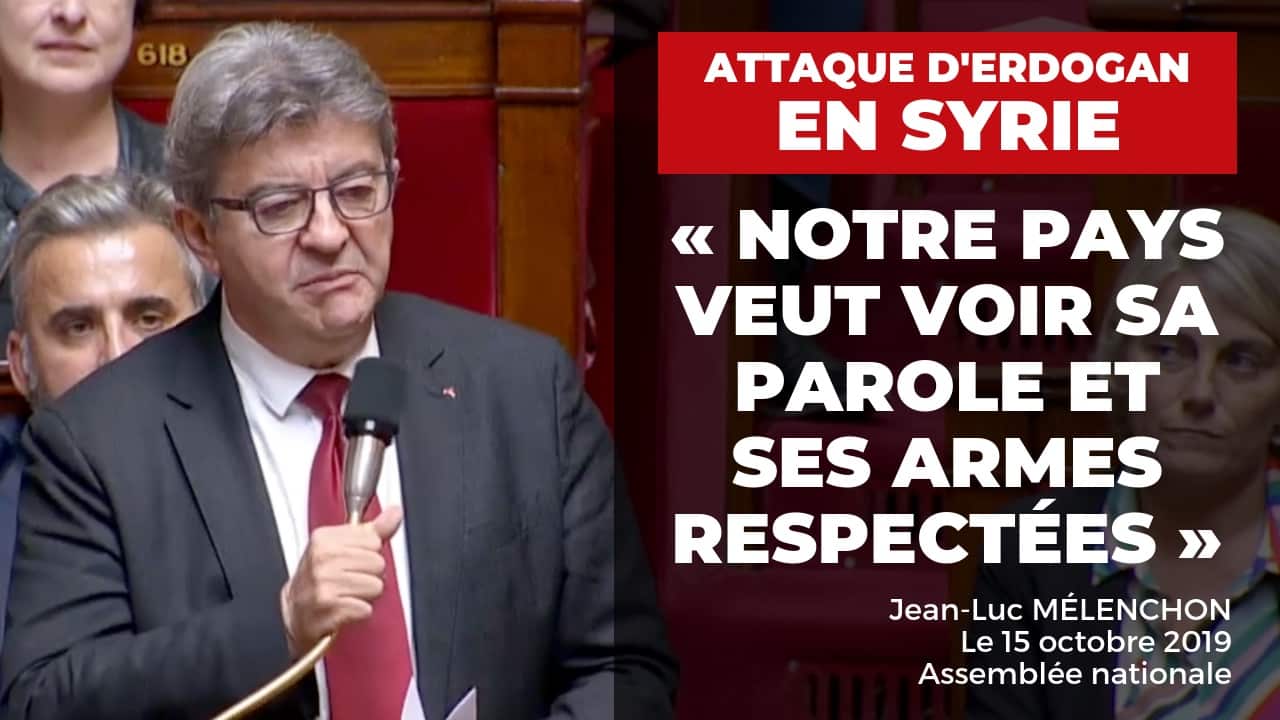 Intervention de Jean-Luc Mélenchon à l’Assemblée nationale le 15 octobre 2019 pour interpeller le Premier ministre sur la situation militaire et diplomatique de la France en Syrie après l’invasion de ce pays par la Turquie pour y combattre les Kurdes.