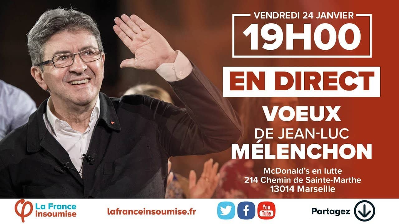 Vendredi 24 janvier à partir de 19 heures, suivez en direct les vœux de Jean-Luc Mélenchon depuis Marseille. Participez sur les réseaux sociaux avec #VoeuxJLM.