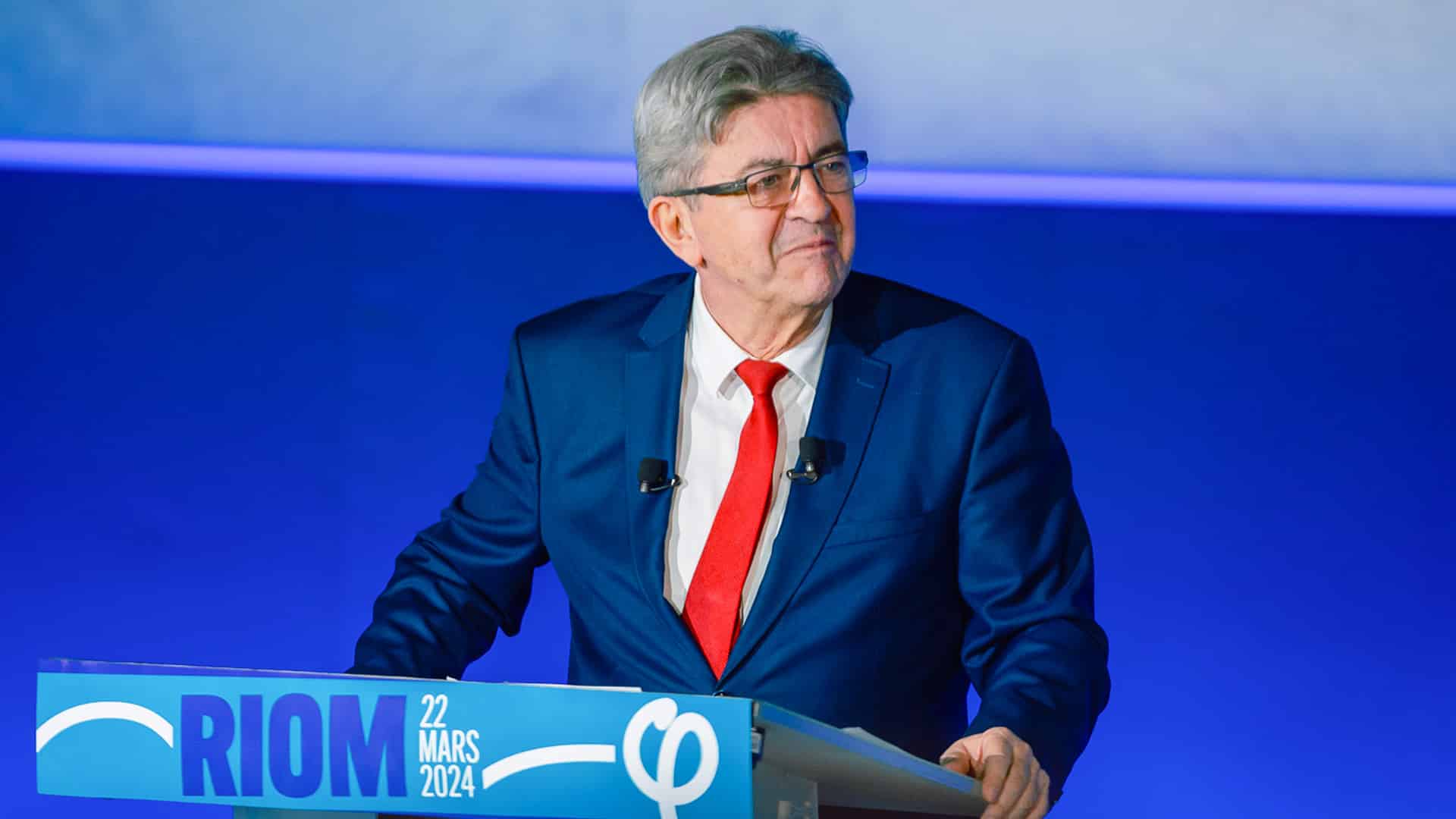 Jean-Luc Mélenchon intervenait à l’occasion d’un meeting sur l’eau à Riom avec la députée Marianne Maximi le 22 mars 2024.