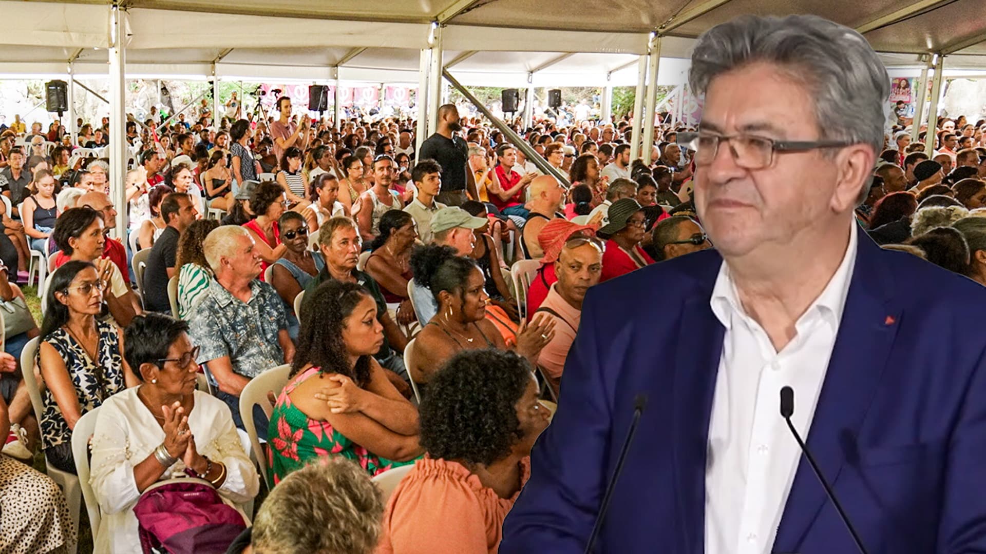 Jean-Luc Mélenchon intervenait lors d’un meeting à La Réunion avec Younous Omarjee et Huguette Bello le 6 avril 2024.