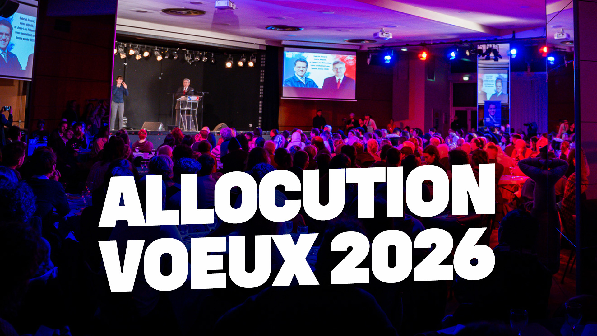 Jean-Luc Mélenchon est intervenu à l’occasion d’une allocution des voeux 2026 avec le député Gabriel Amard à Villeurbanne, le 9 janvier 2026.