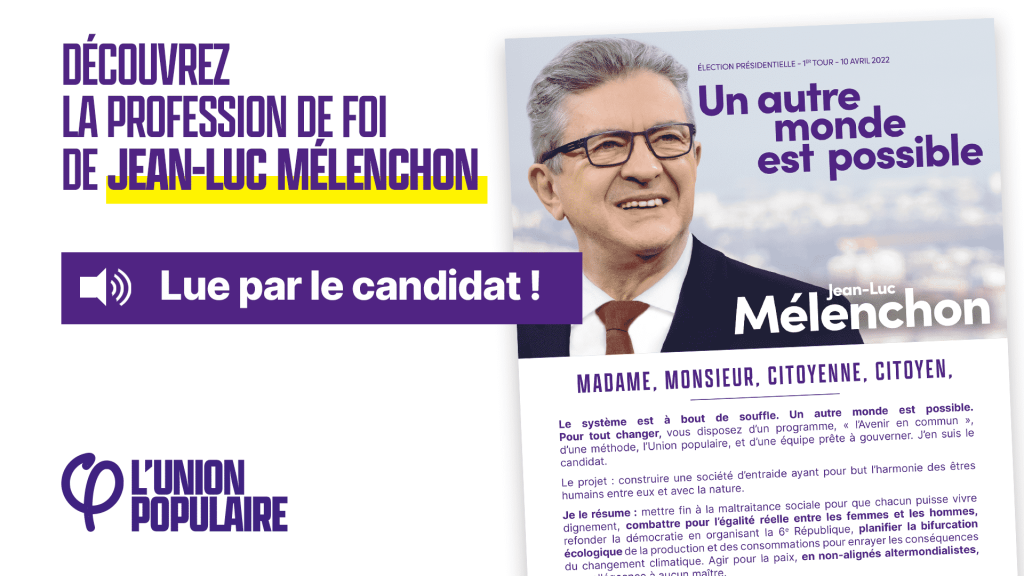 Découvrez la profession de foi de Jean-Luc Mélenchon disponible en format audio lue par le candidat de l’Union Populaire ! Vous pouvez également la consulter en version PDF accessible web, ainsi qu’en version « Facile à lire et à comprendre ». N’hésitez pas à télécharger ces documents et les partager autour de vous. La version audio notamment […]